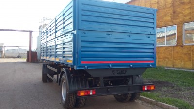 Прицеп может комплектоваться пологом с наматывающим устройством, задними распашными воротами, люком под зерномет.